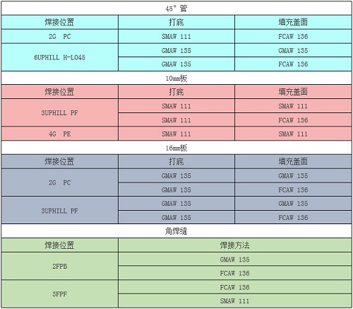 組合件包含管、10mm板、16mm板和角焊縫四個(gè)試件。焊接完成后進(jìn)行外觀(guān)檢查、折斷檢驗、射線(xiàn)探傷。四個(gè)試件的焊接方法和焊接位置在賽前從下表中抽取確定。
