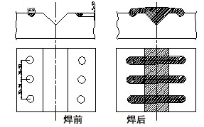 此種焊接方法主要用于工作應力較大,工件相對較厚的焊縫,如大型機器的底座等工件。鉚釘可用碳鋼承擔,焊鉚釘時(shí)可用J507焊條焊接,主焊縫仍舊用鎳基182焊條。焊接時(shí)先將坡口內焊滿(mǎn),最后焊鉚釘,使鉚釘和坡口內焊縫形成一個(gè)整體焊縫。